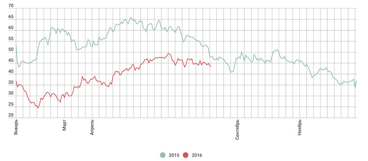 Chart 4. Change in price of Urals oil ($/barrel) and exchange rate of the ruble (rubles/$) in 2016
