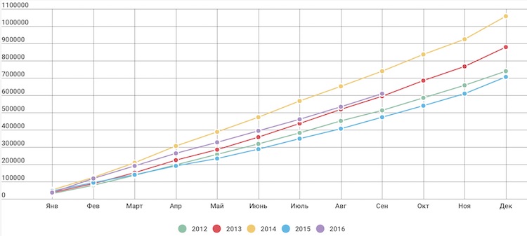 График 1. Продажи новых легковых автомобилей в России, 2009-2016 гг. (штуки, нарастающим итогом с начала года)